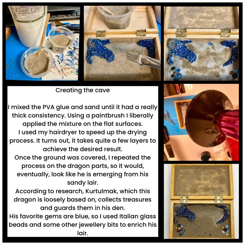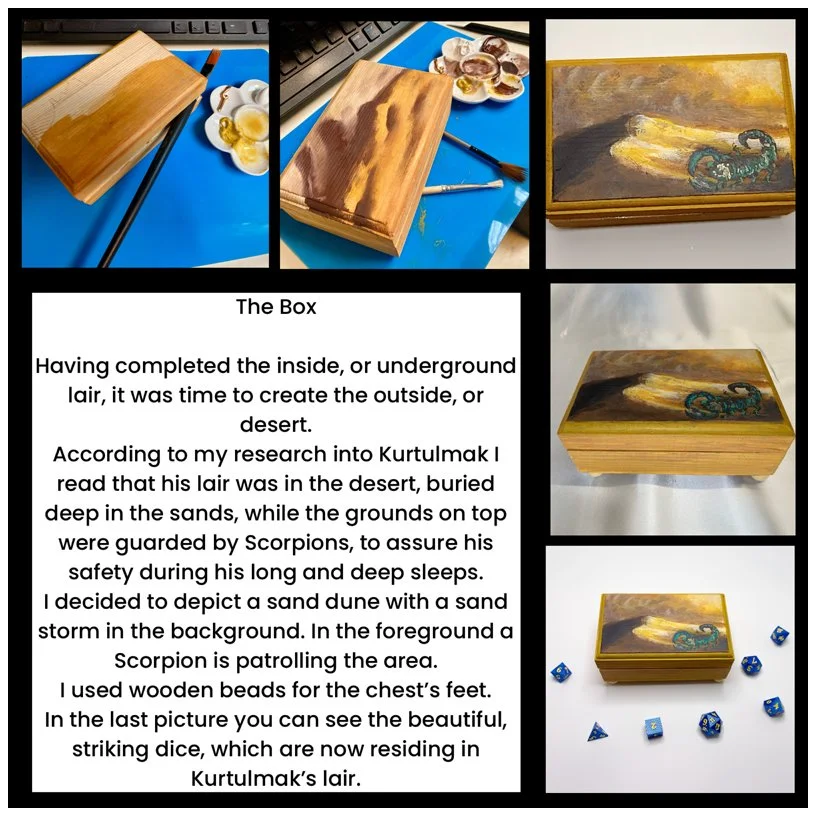This commissioned, handcrafted dice chest was inspired by Kurtulmak, a dragon revered by many D&D fans. Commissioned with a vision of an ancient, bright blue dragon whose lair lies deep beneath the desert, the box tells his story inside and out. The exterior is painted in sandy desert tones, with a lone scorpion guarding the lid. Opening the chest reveals a cave-like interior, sculpted with a dragon’s head and tail in opposing corners, brought to life in shimmering iridescent blues to match the dice it protects. Scattered treasures of glass beads and fine chains gleam from the sand-textured walls, hinting at the dragon’s hoarded wealth. Both a functional dice box and a unique piece of art, it’s perfect for adventurers seeking a truly one-of-a-kind home for their dice. The pictures below are showing you the process, in case you would like to create one yourself, too. Should you prefer not to do that, I am happy to make one for you, of course.