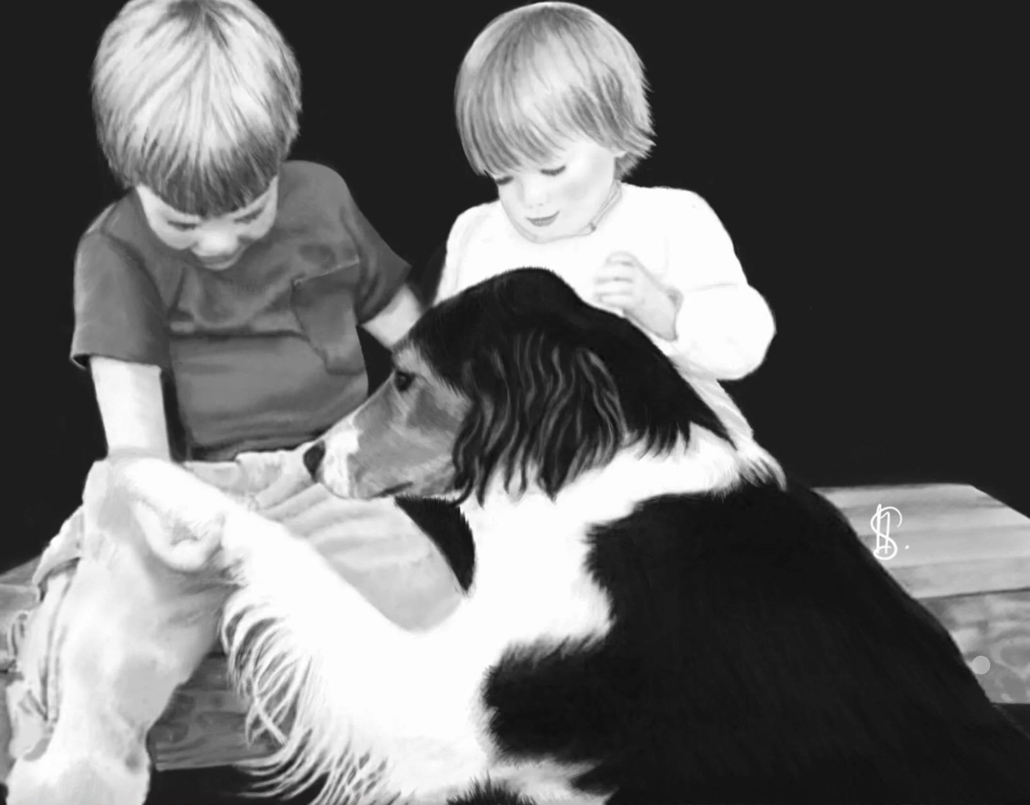 Logo was possibly part Collie, part Beagle, and came to live with Miss S, when she got married. Logo quickly became best friends with her husband; the two of them were inseparable very soon thereafter. Logo also took great pride in minding his tiny humans. Ms S asked me to do a drawing of the trio for her husband, as Logo was such a big part of their lives for so long.