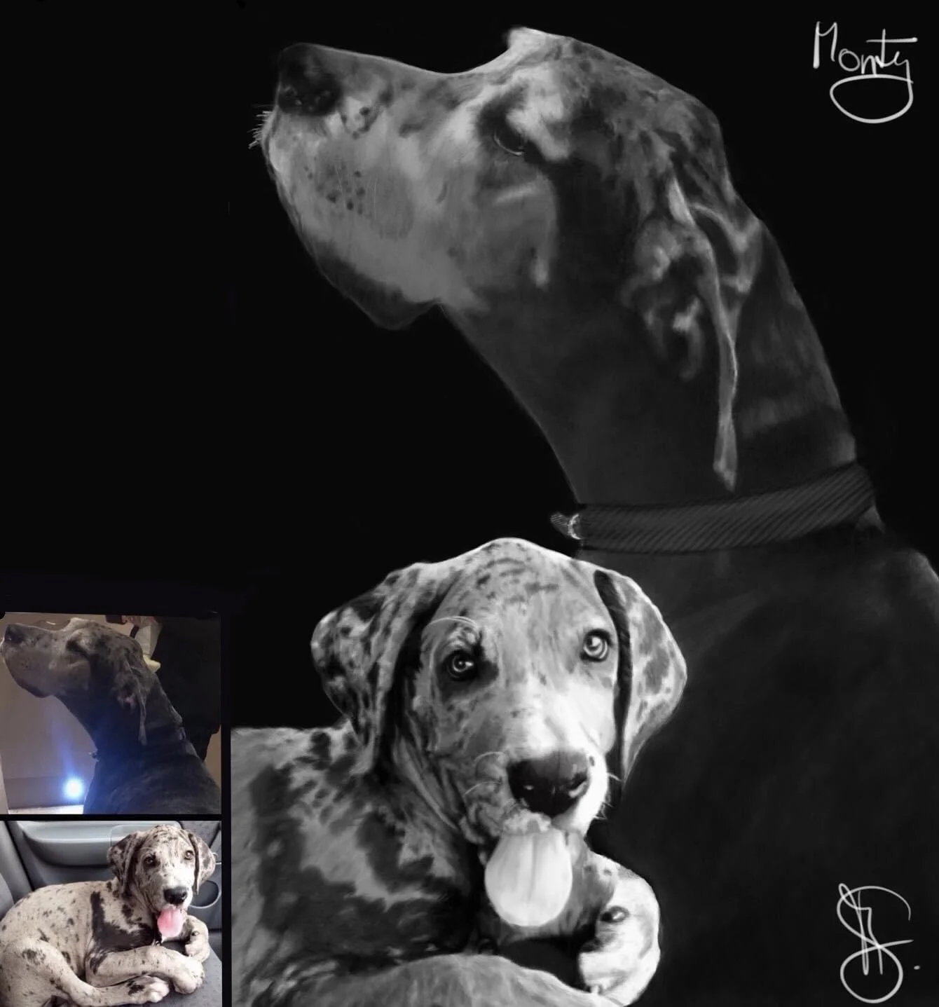 At the time of this drawing, Monty is a 5yr old Blue Merl Great Dane, who belongs to my friend, Bernie.