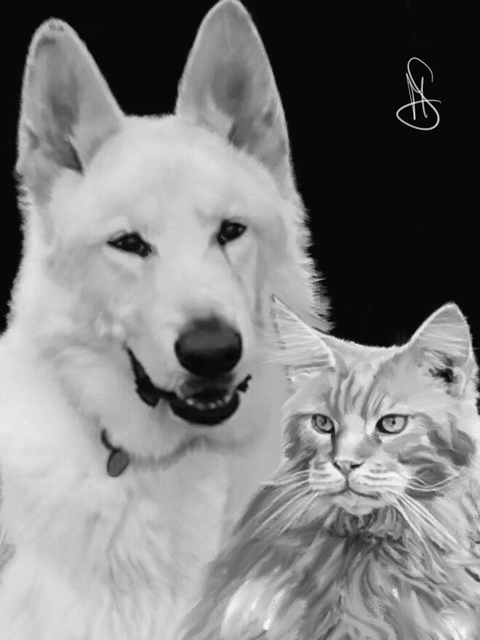 At the time of this drawing, these two wonderful creatures lived with Susanne and her family. Susanne got Snow as a pup and had him for 7 yrs at that point. Snow is a huge Wolfsation - the only thing bigger than him is his heart. And his love for tennis balls. One June, Susanne’s friends emigrated to Spain and couldn’t bring their cat, Fenix, a ginger, 8kg Maine Coon, who was then about 3 yrs old. Sue took him in. Thankfully, Snow took Fenix into his furry embrace and the two could often be found snuggling together in front of the fire, or amongst the enchanting Fairy Houses Susanne built in her spectacular garden. A simply wonderful happenstance. 💖🤍🧡💖
