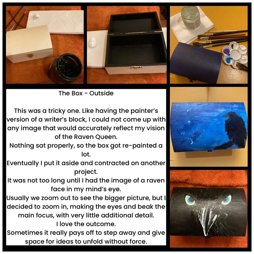The pictures below will show you some close ups and the progress of the box creation, in case you would like to recreate one yourself. Should you not want to do that, I am happy to make one for you, of course.