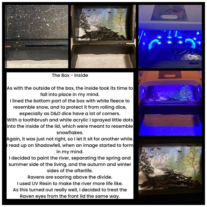 This dice chest was commissioned for a gift. It was requested that it was based on the lore of the Raven Queen. The creative freedom was left in my court, which is always a little daunting yet exhilarating.